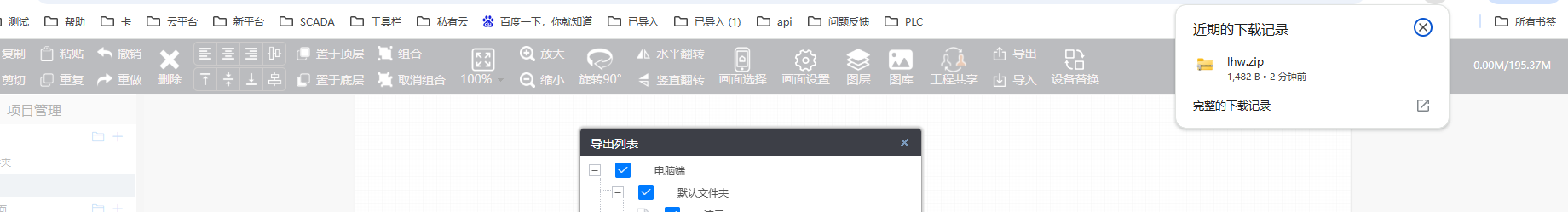 操作方法:(1)进入【项目中心】—>【设备监控】,选择编辑组态,点击“导出”,