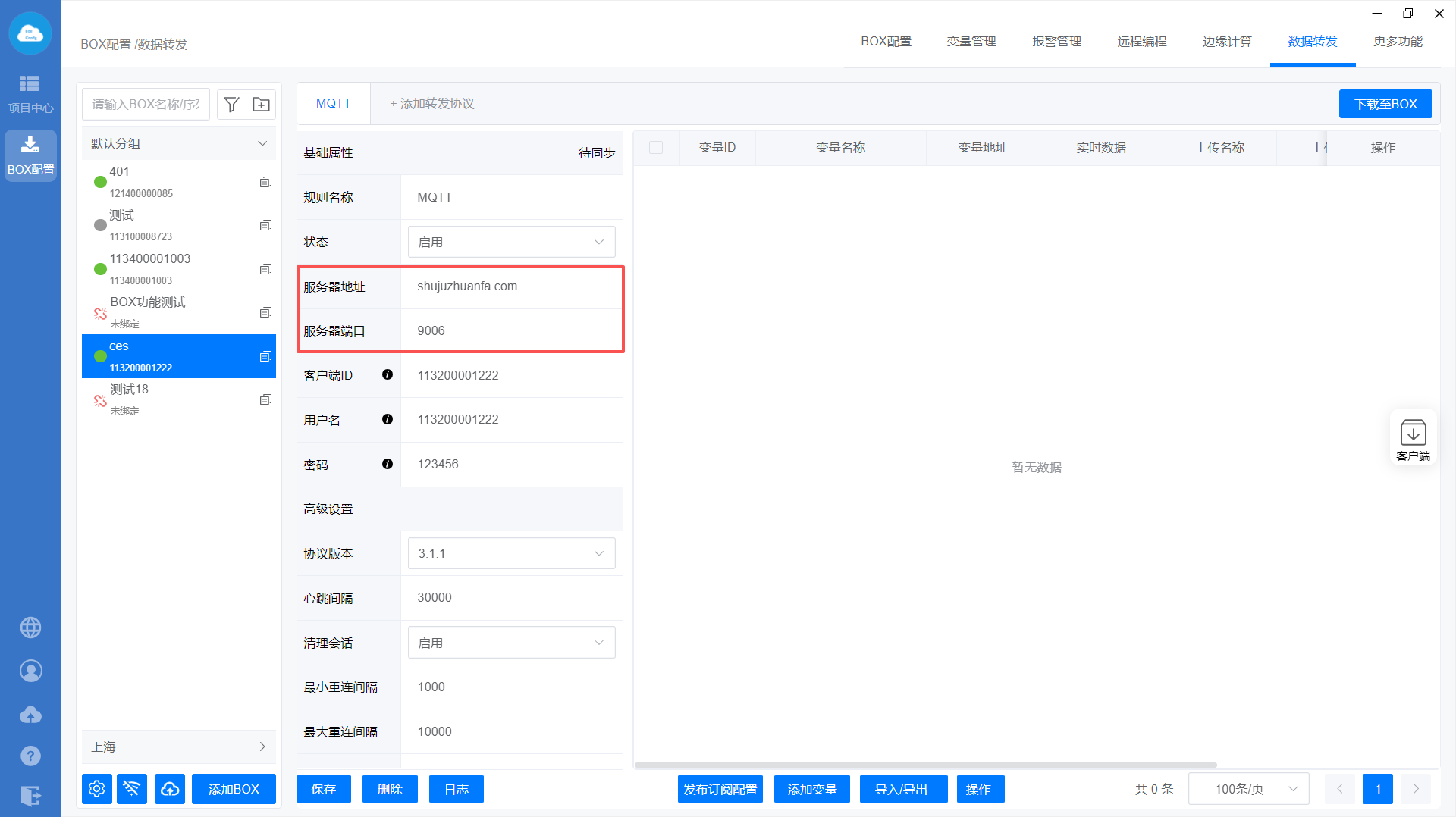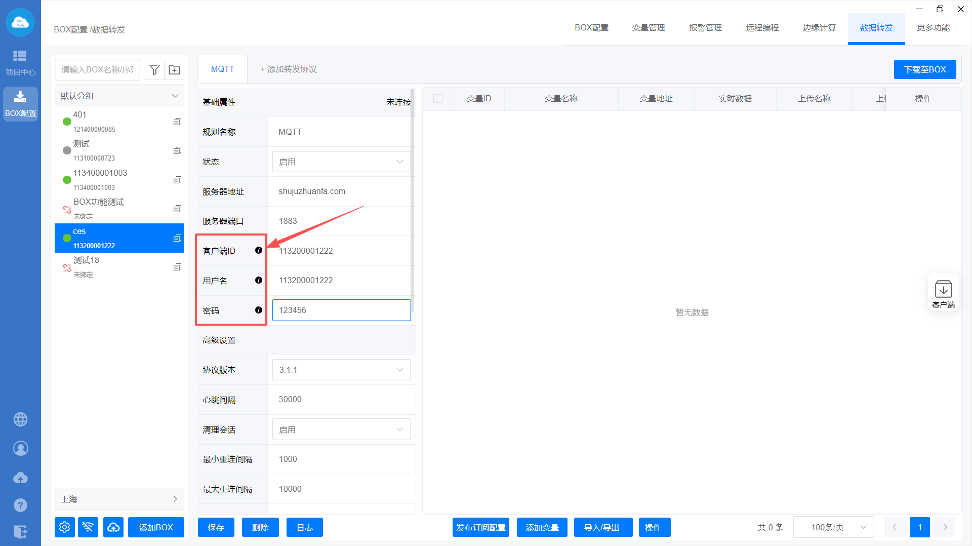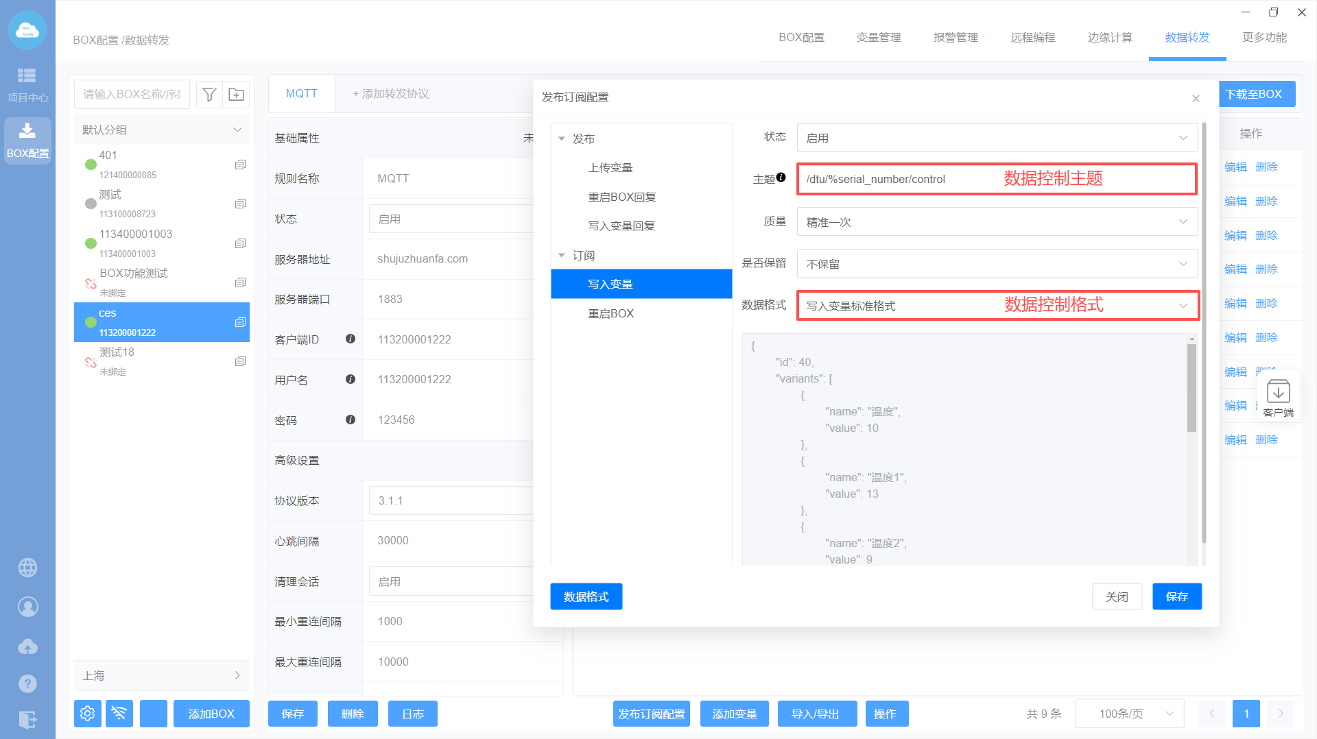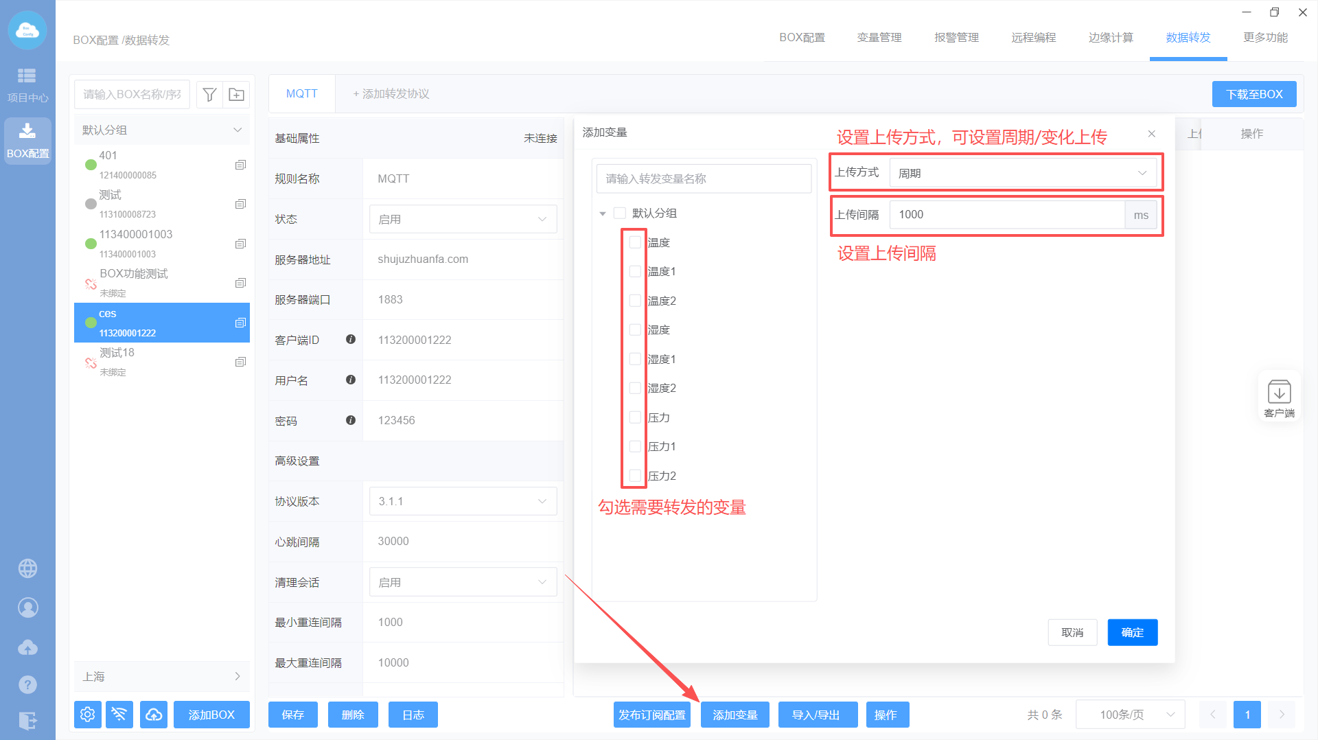 添加MQTT转发协议—>设置转发基础属性—>添加转发变量—>下载至BOX