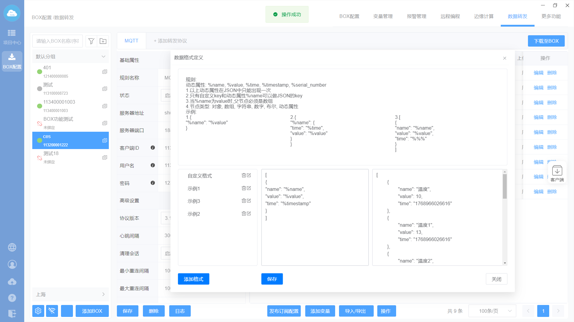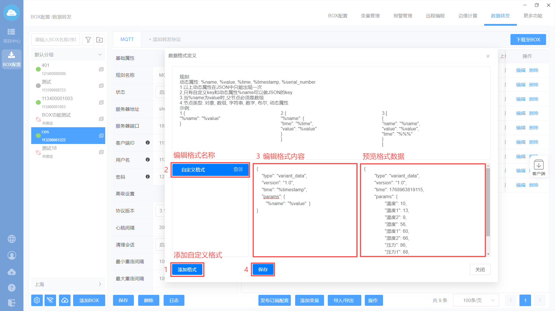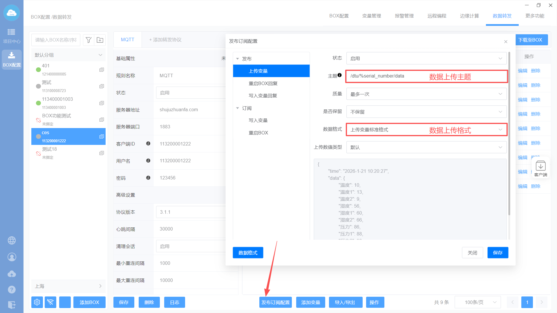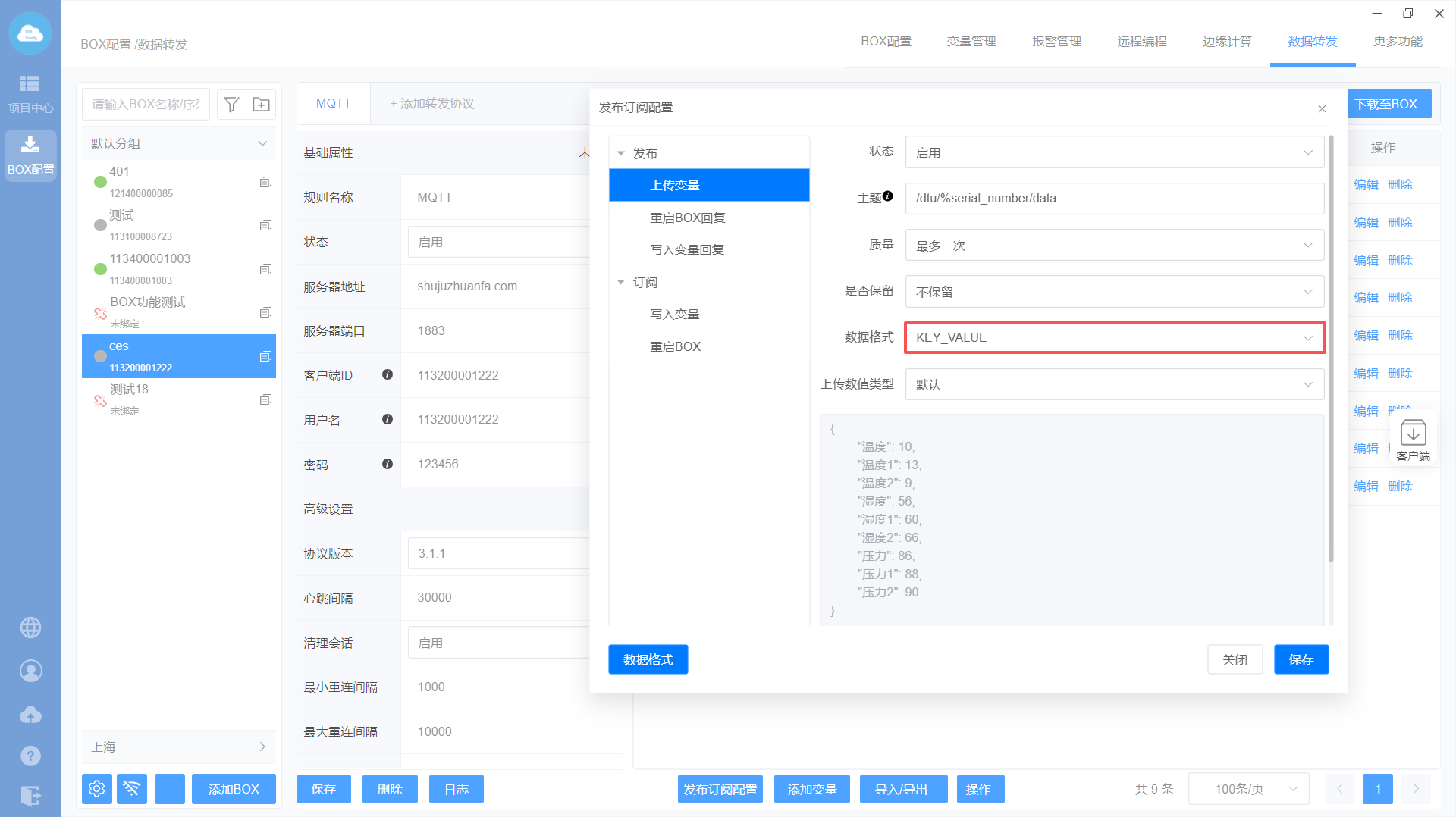 添加MQTT转发协议—>设置转发基础属性—>添加转发变量—>下载至BOX