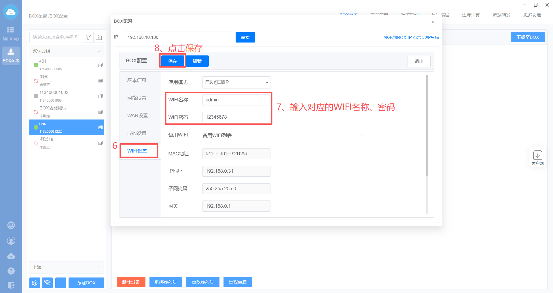 - 电脑与BOX网线直连(多网口直连LAN口),电脑网卡IP需要设置和BOX IP同一网段;