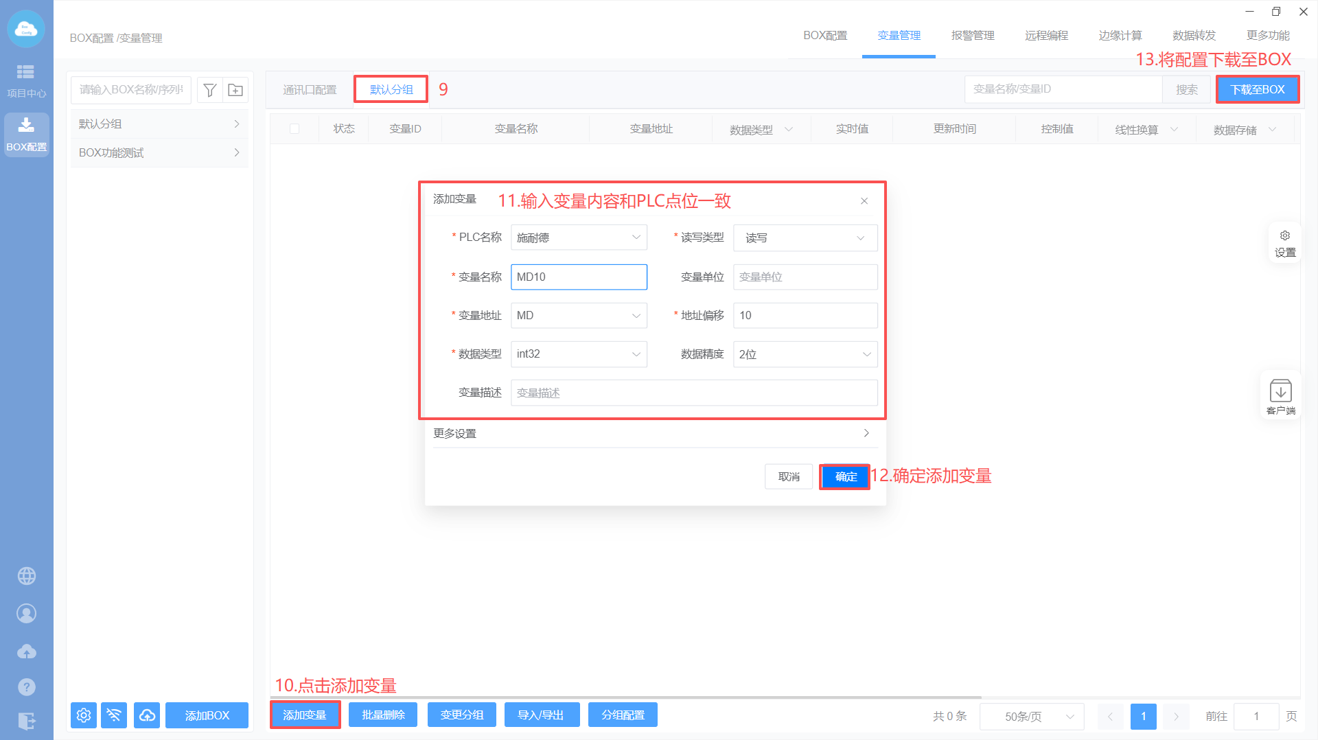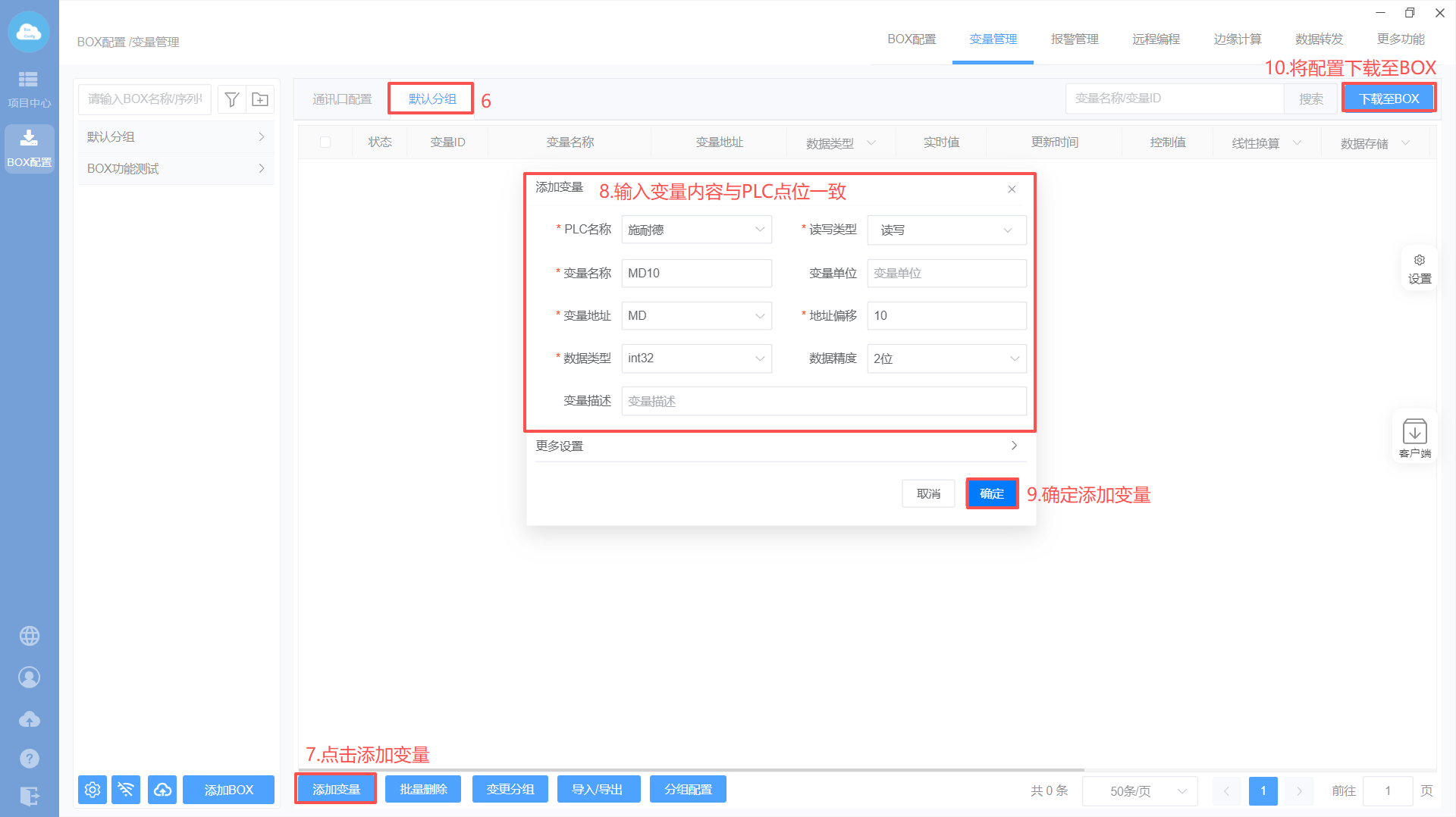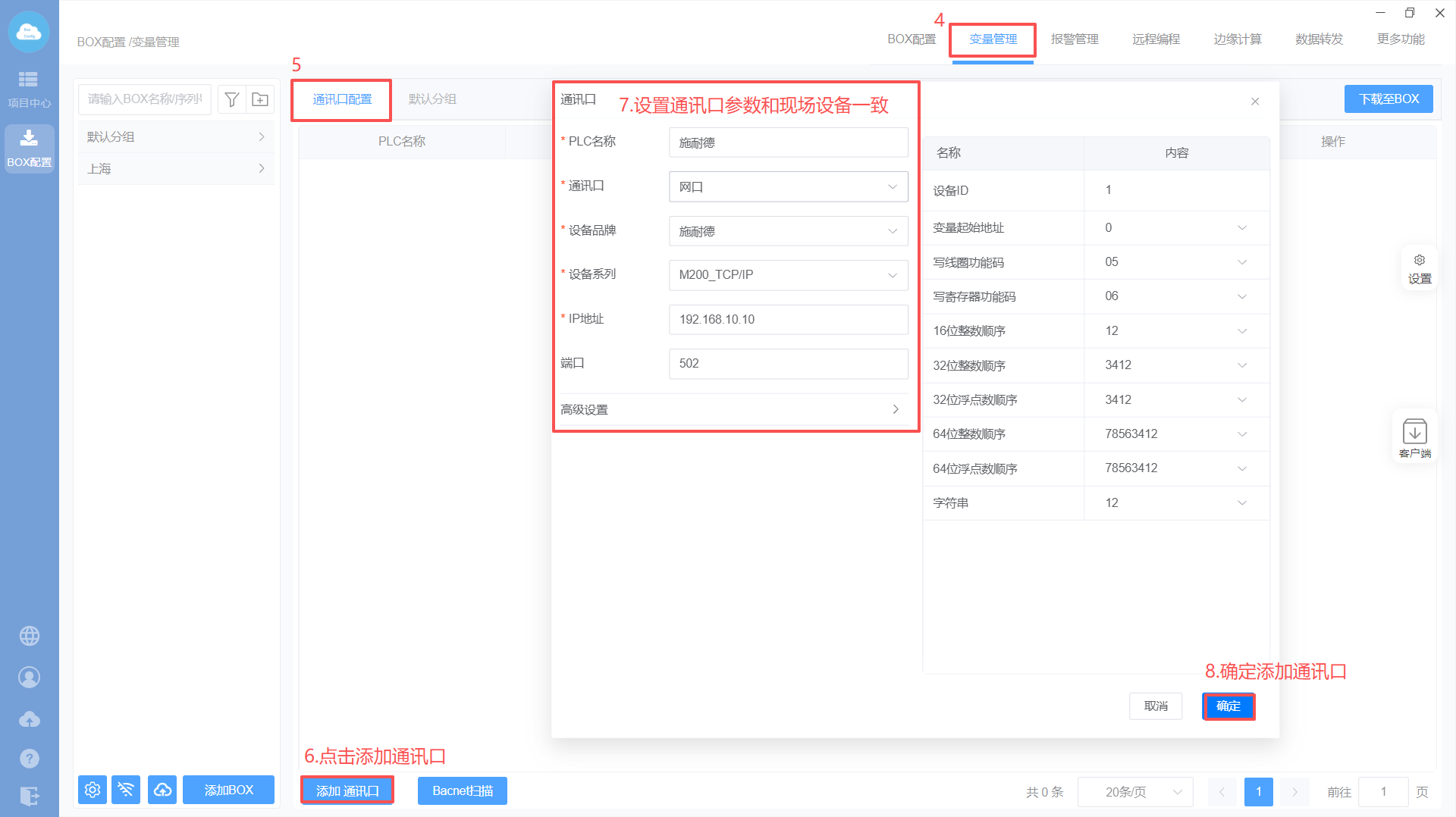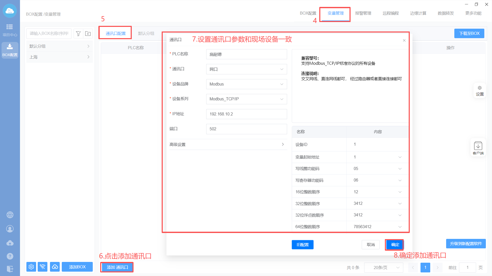 - Box设置(注意:修改box参数,与PLC保持在同一网段)