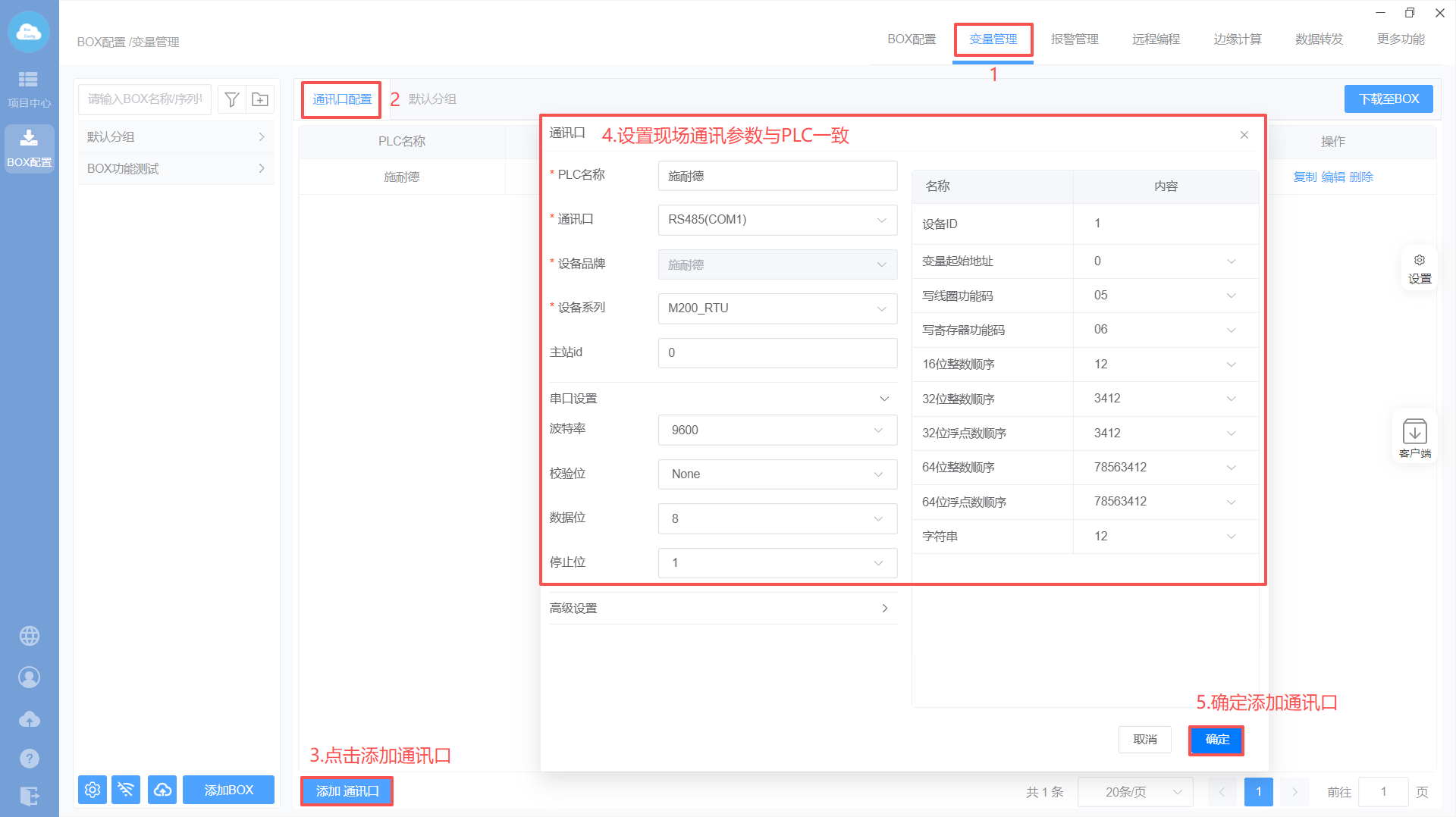 - 设置BOX串口参数(和PLC设置保持一致)