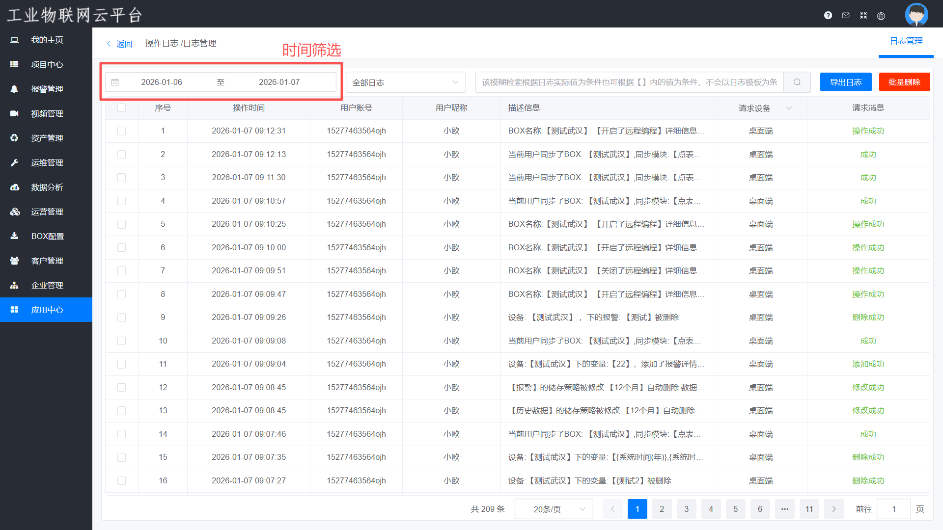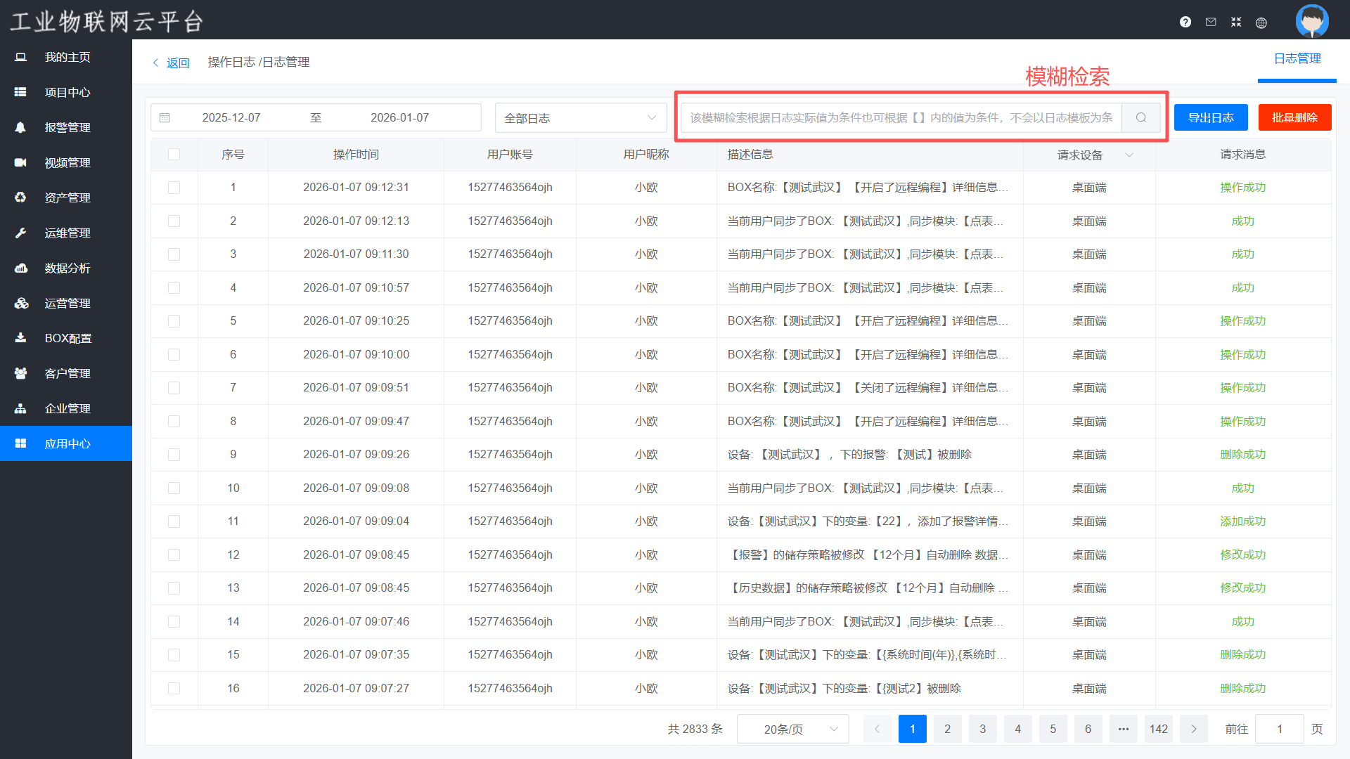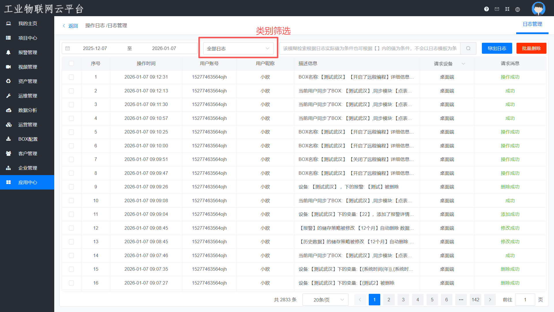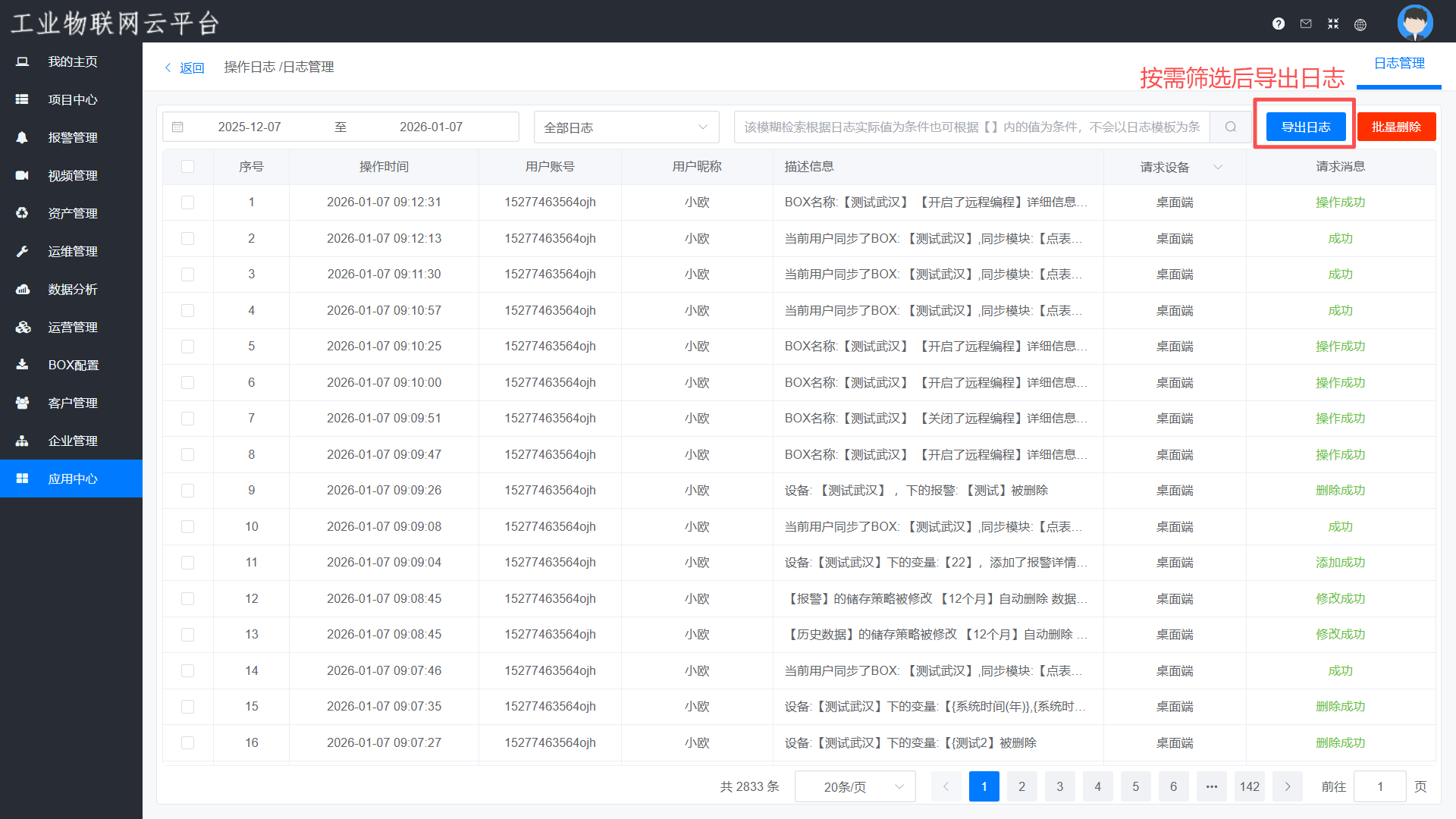 可以查询到账号下所有控制类、修改类、设置类、登录类的敏感操作进行记录存储,可以以时间或模糊检索为导向查询日志,并且查询到的日志可以直接导出Excel表格。导出的Excel可筛选项目和企业类别的日志内容,表格记录详细的操作时间、用户账号、用户昵称以及操作信息,精确地记录某一时间段某账号操作的所有内容,方便有人操作出现问题的时候起到追溯的作用。