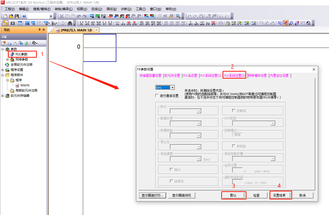 三菱的FX3U/FX3G使用编程口通讯,PLC参数里采用默认设置就行。无需在PLC软件里做通讯设置,设置完下载至PLC之后,断电重启PLC生效。