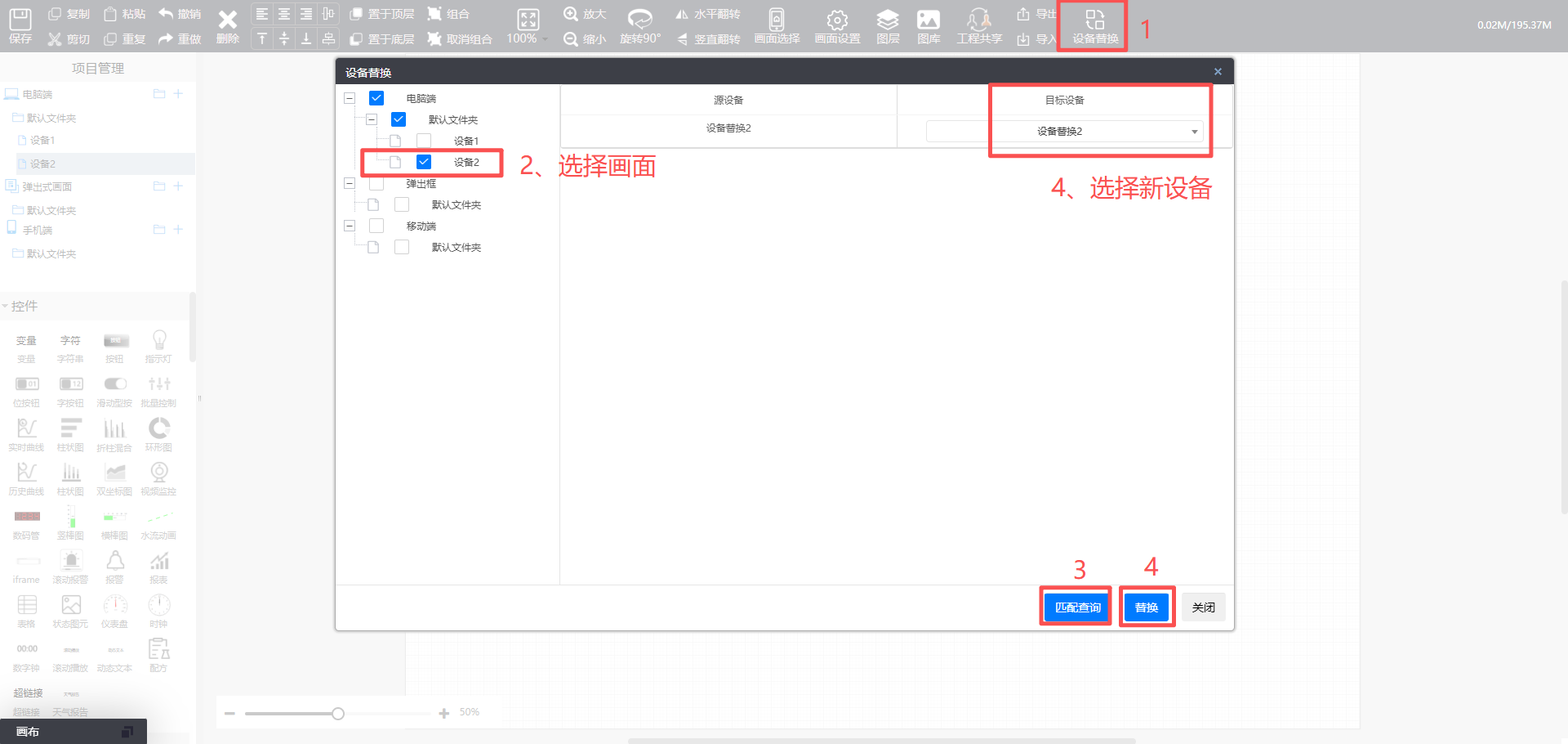 1. 点击“设备替换”,选择新画面,点击“匹配查询”,再目标设备一栏选择新设备,然后点击替换