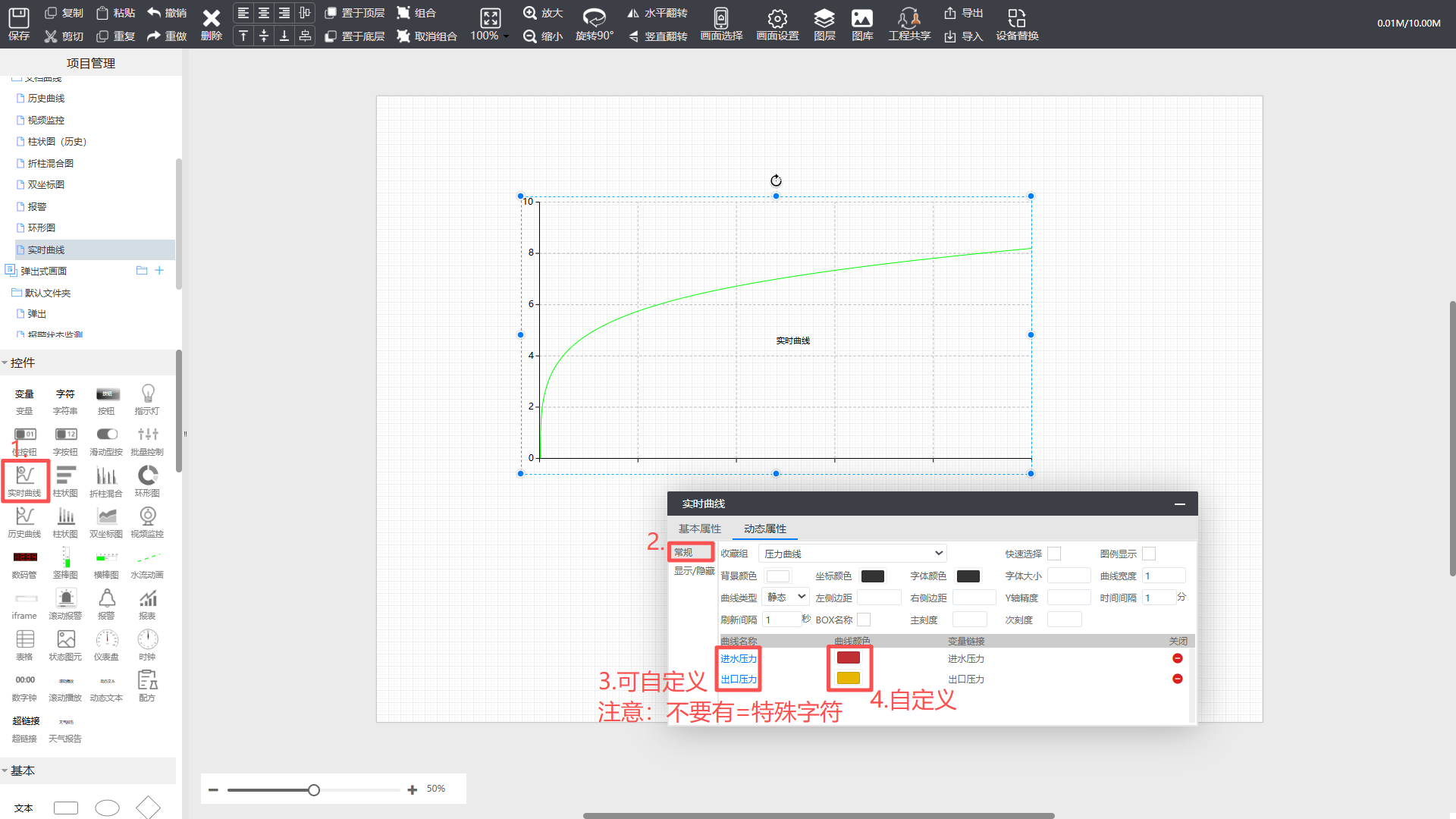 图例显示:是否显示图例,图例为曲线名称,图例颜色和曲线颜色一致;在运行态可点击图例显示隐藏曲线