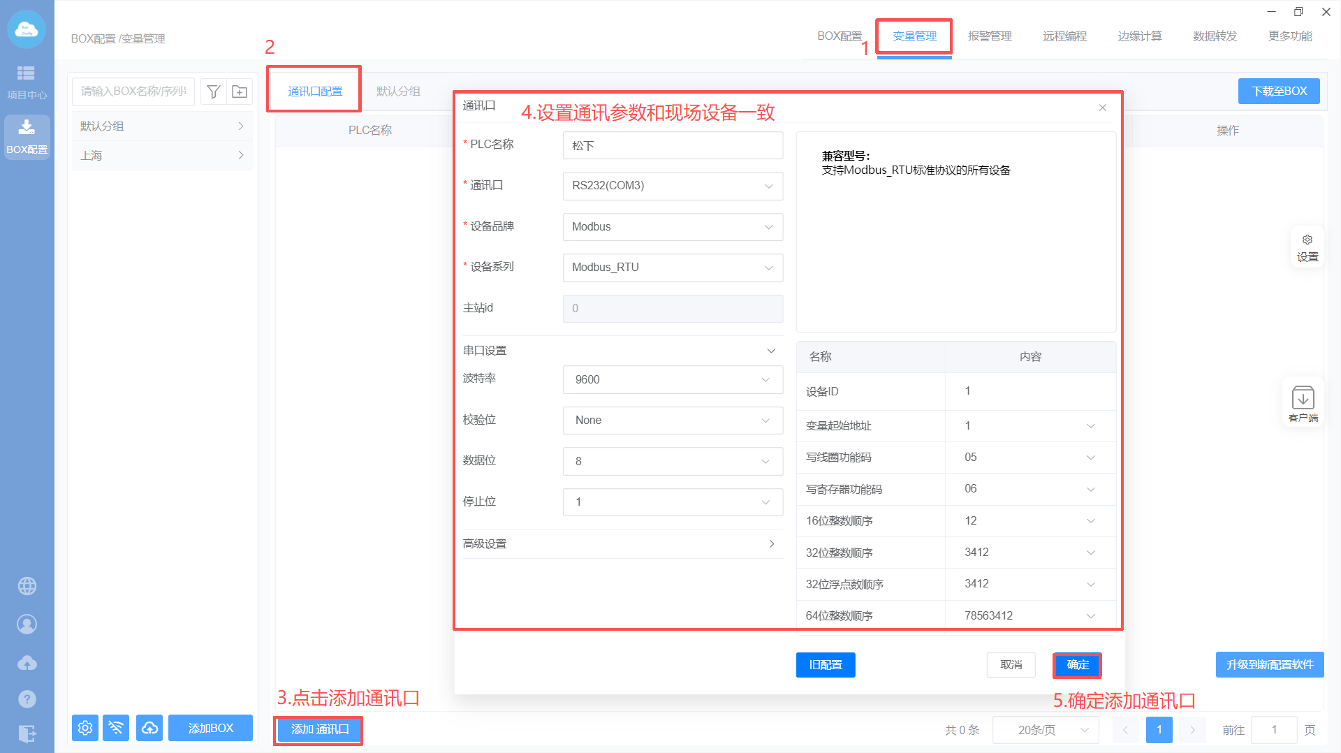 1. Box设置(注意:修改box参数,与PLC的串口参数保持一致)