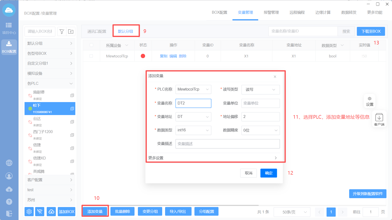 选择PLC,添加PLC变量地址信息后点击“下载至BOX”