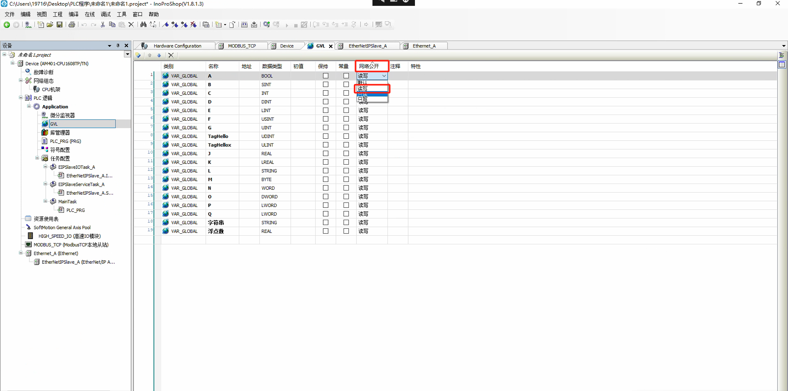 注意:只支持BOOL、INT、DINT、REAL、STRING、BYTE 6种数据格式
