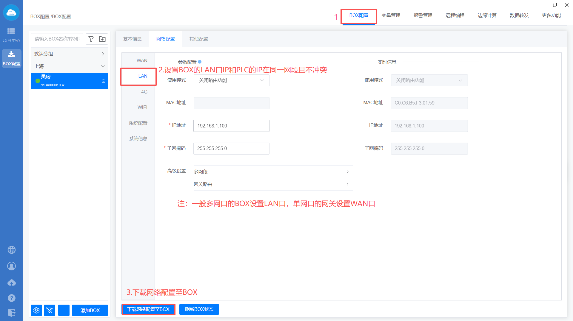 - Box设置(注意:修改box IP,与PLC保持在同一网段)