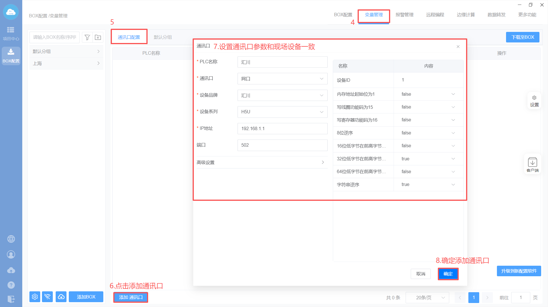 Box配置(注意:修改box参数,与PLC保持在同一网段)