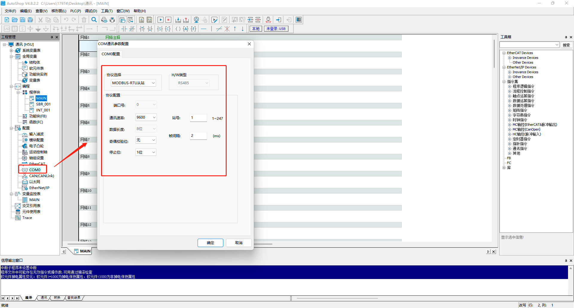 在AutoShop软件中设置对应com口为下载/HMI监控协议