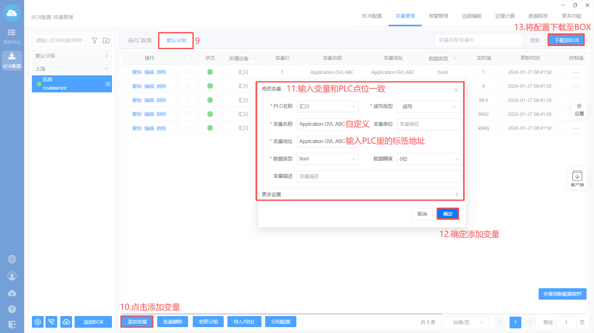 - BOX配置(注意:修改box参数,与PLC保持在同一网段)