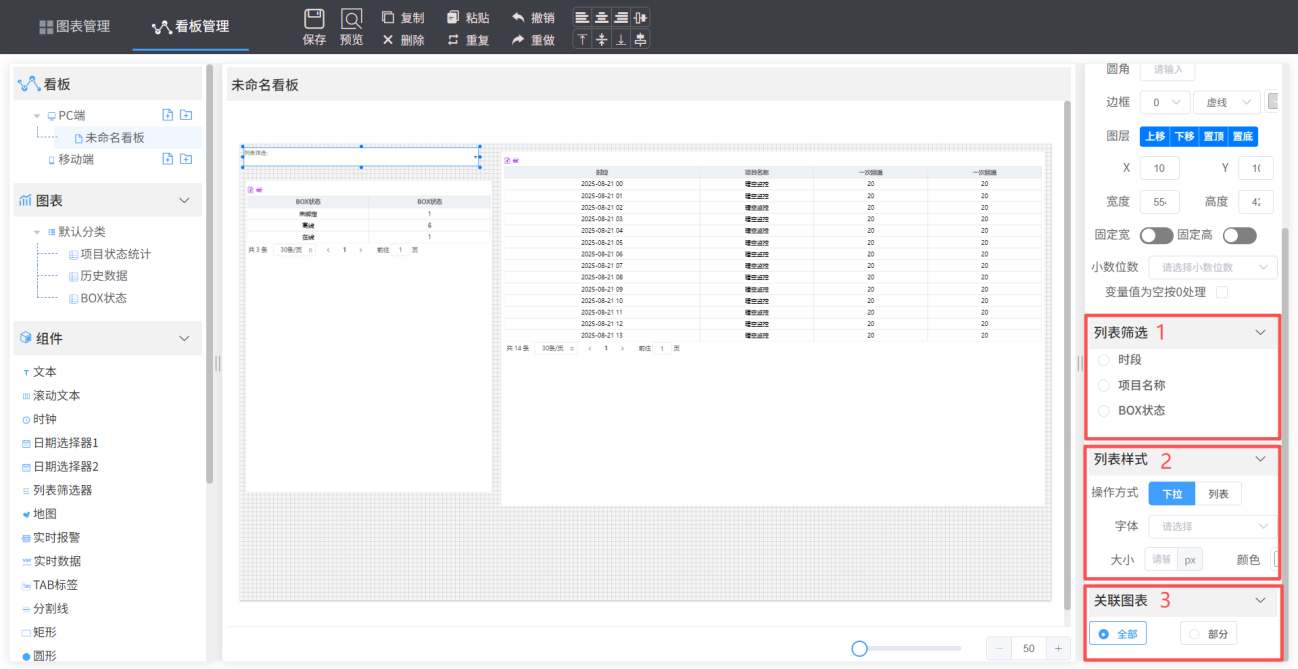 - 列表筛选:将当前看板内所有的维度提取出来,选择一个维度进行筛选