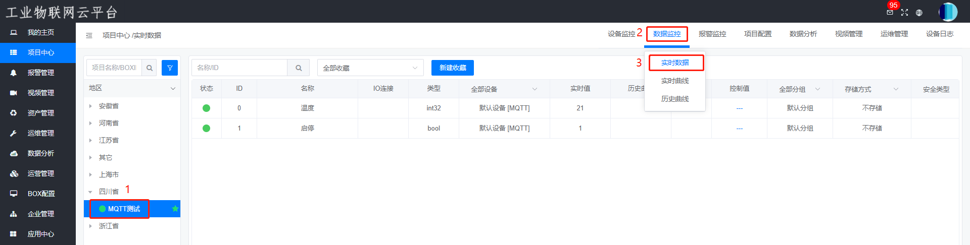 【项目中心】——【数据监控】——【实时监控】可以看到添加的变量及属性;