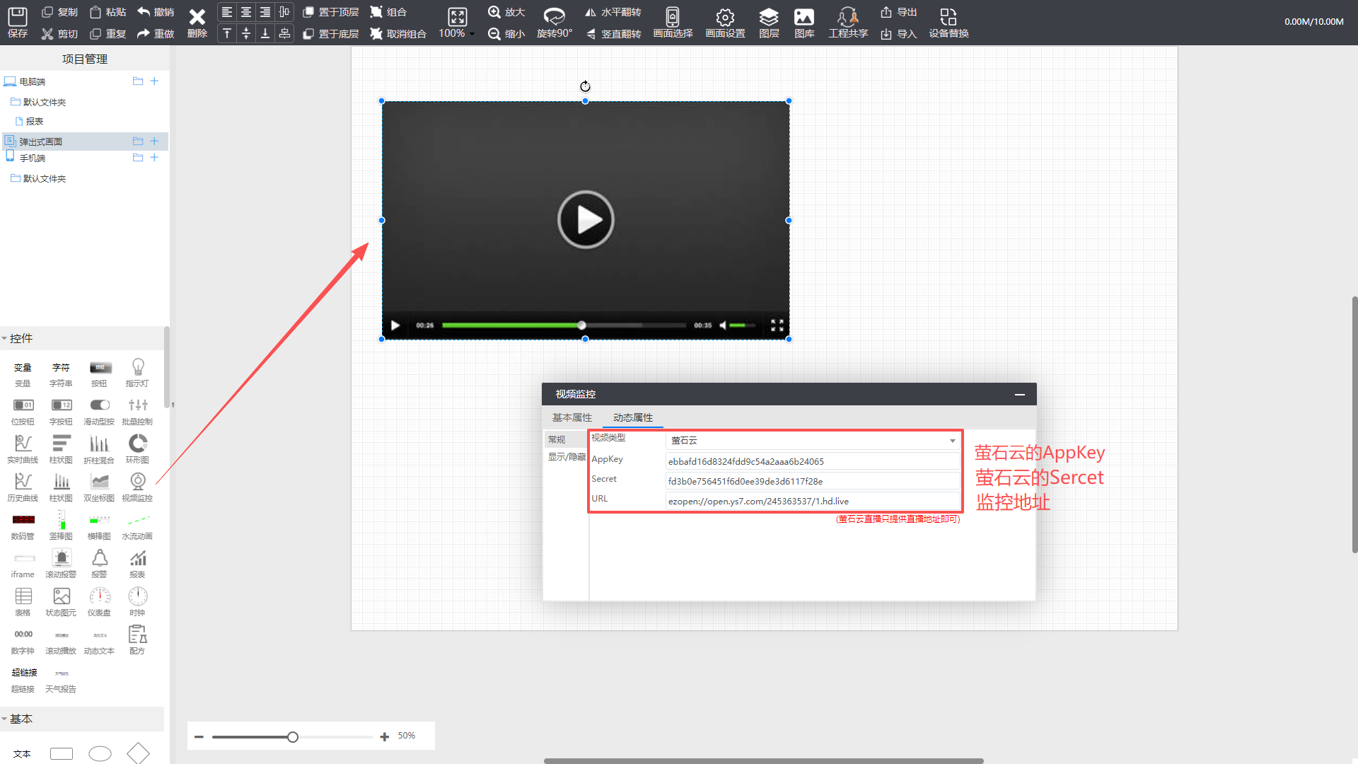 进入【项目中心】—>【设备监控】—>【编辑组态】,添加“视频监控”元件到组态,双击点开属性,视频类型选择萤石云,填写Appkey、Secret、和URL