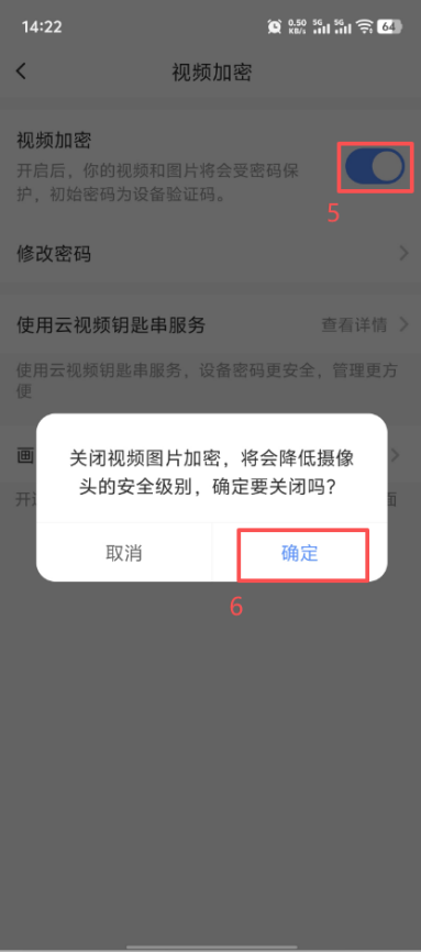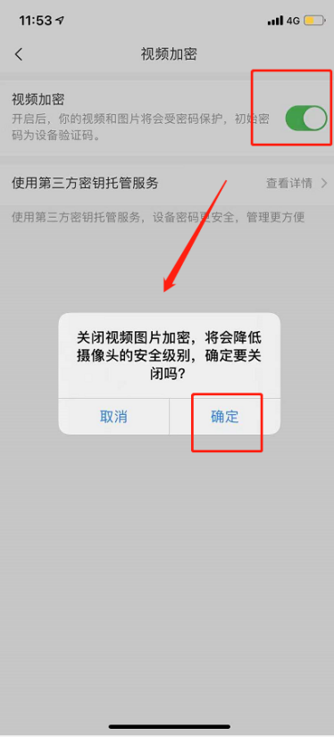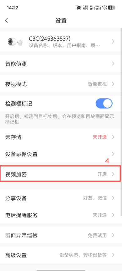 点击“萤石”,找到设备,然后点击...,跳转到设置界面,找到“视频加密”,点击后设置取消加密。