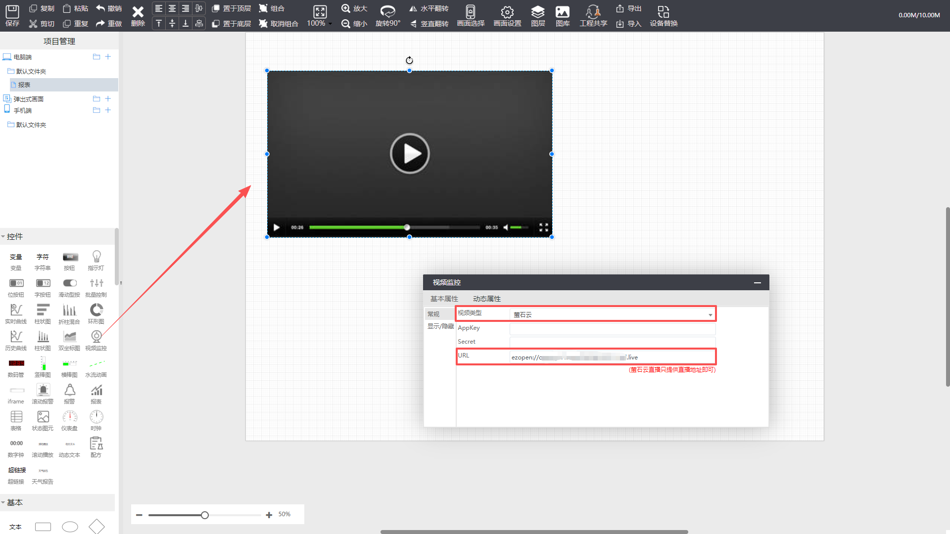 进入【项目中心】—>【设备监控】—>【编辑组态】,添加“视频监控”元件到组态,双击点开属性,视频类型选择萤石云,在URL里填写直播地址