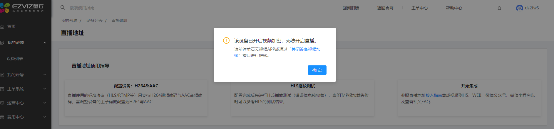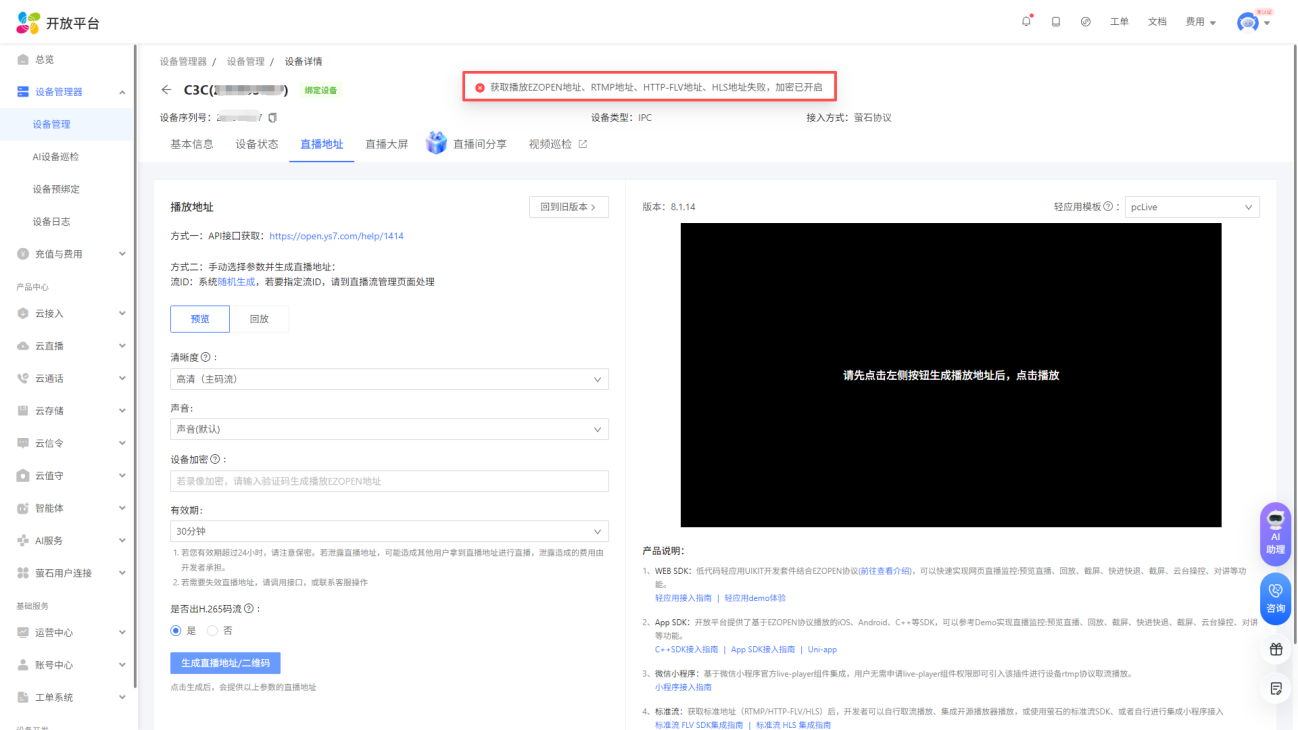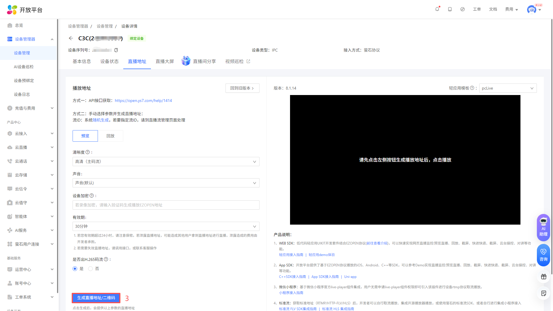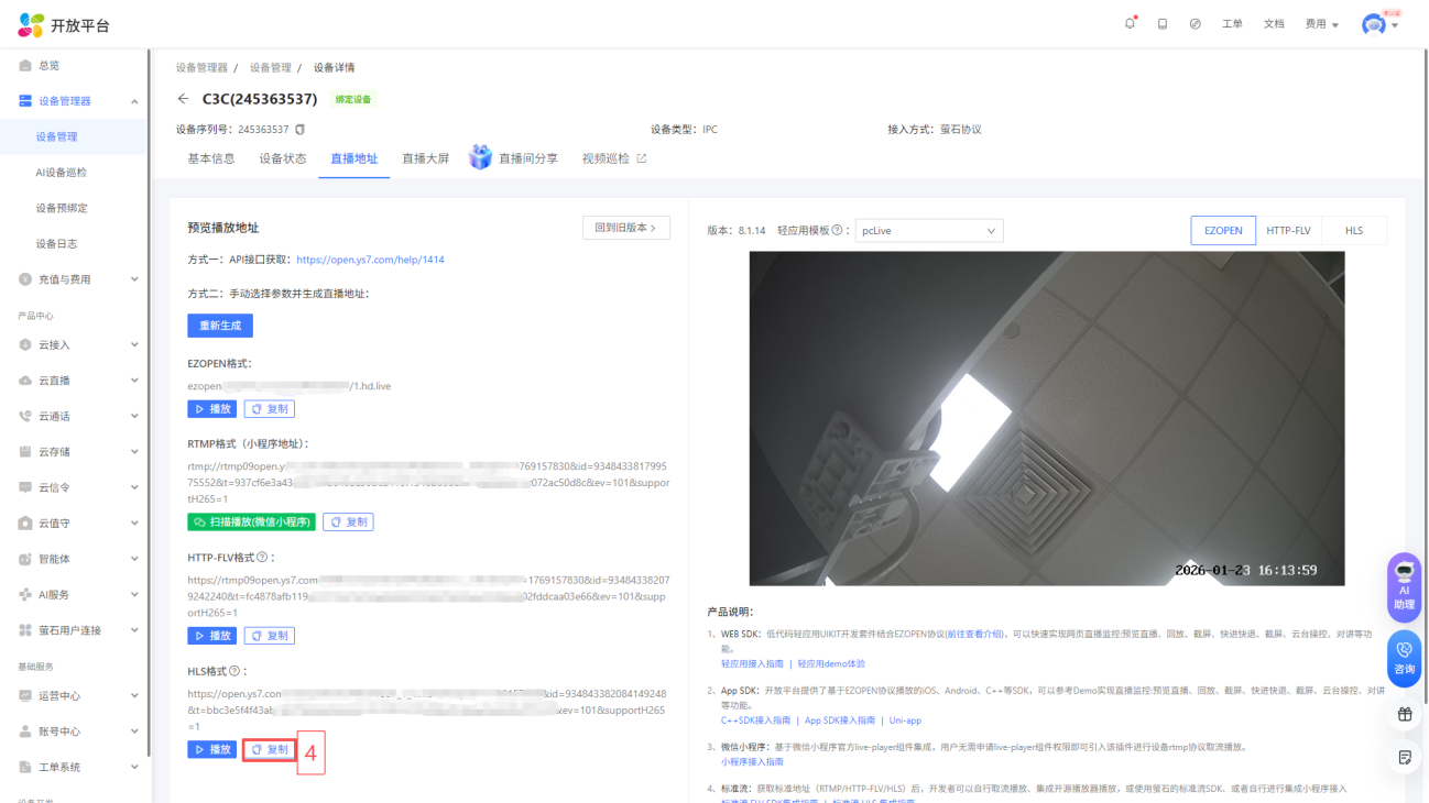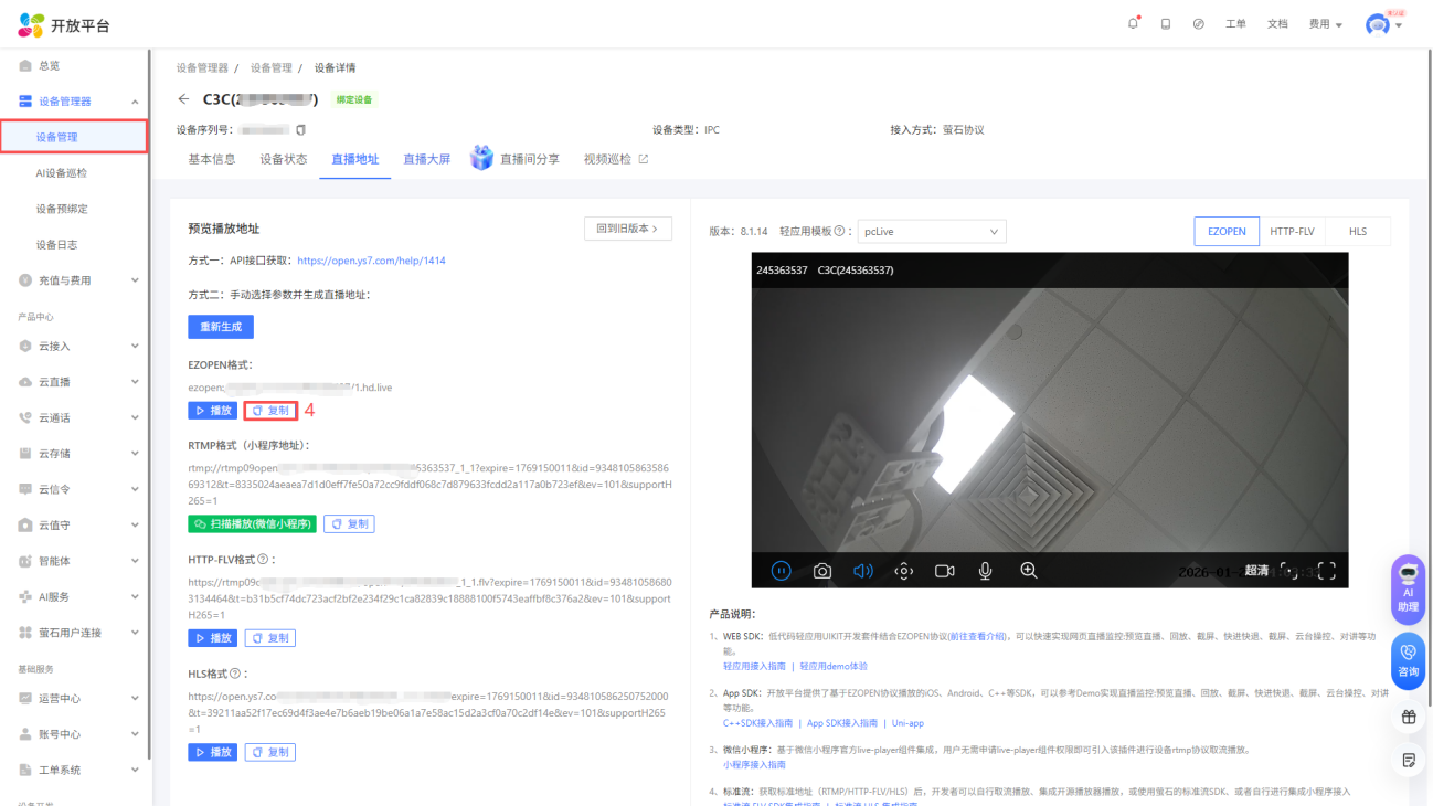 进入控制台页面后, 点击设备管理器-设备管理,选择您将使用的设备, 点击“视频直播”,选择EZOPEN格式地址,然后点击复制,在云平台填写(设备与萤石云之间的绑定请查看说明书或咨询客服)