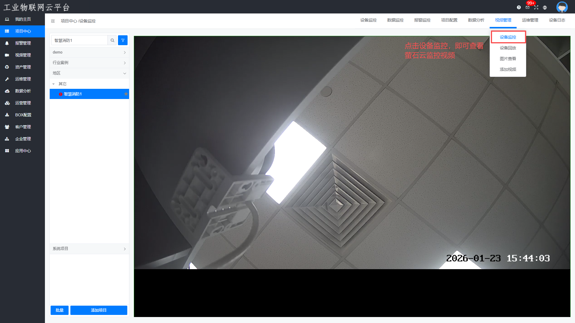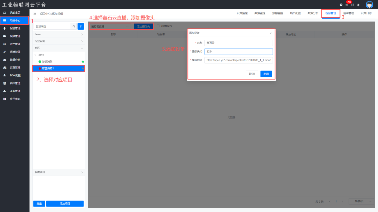 进入【项目中心】—>【视频管理】—>【添加视频】—>选择“萤石云监控”,点击“添加摄像头”,添加完成后点击“播放”查看摄像头画面