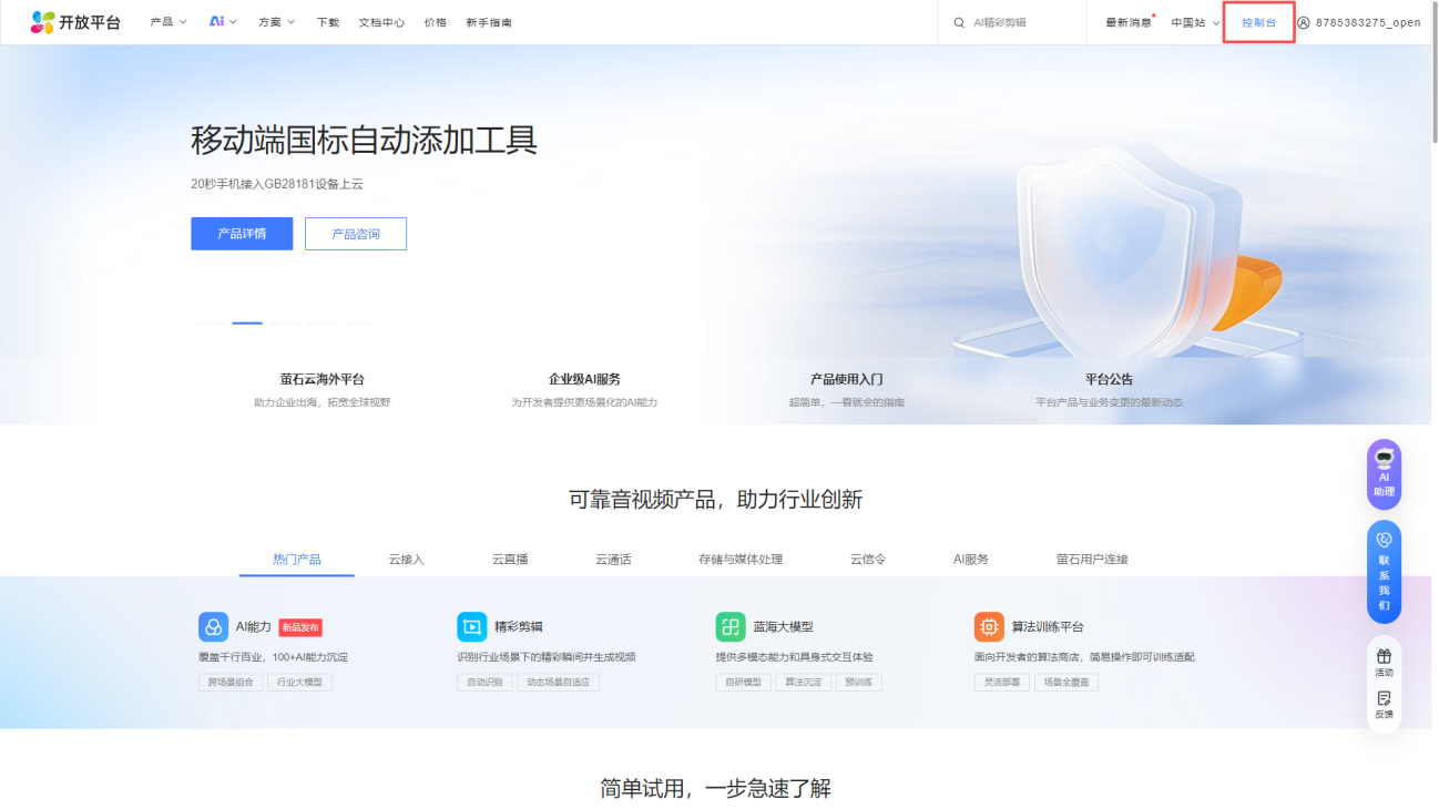 进入萤石云开放平台:https://open.ys7.com/,点击右上角登录