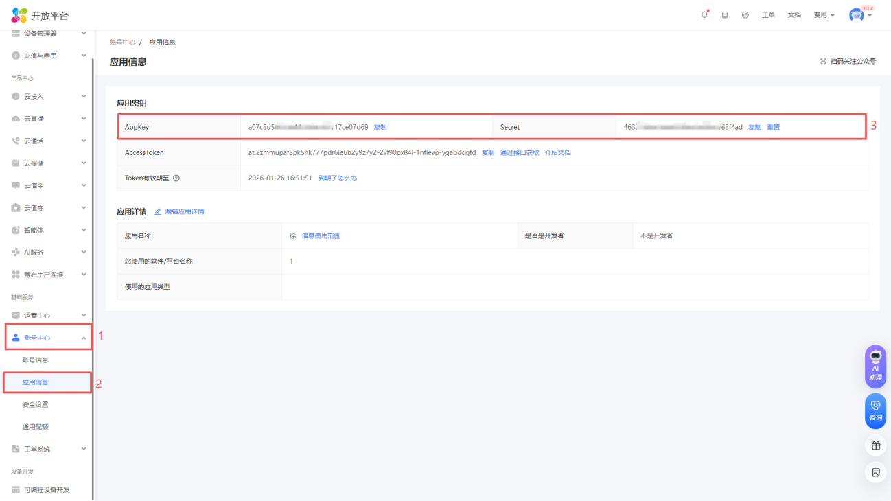 进入控制台页面后, 点击账号中心-应用信息,复制AppKey和Secret,填入云平台