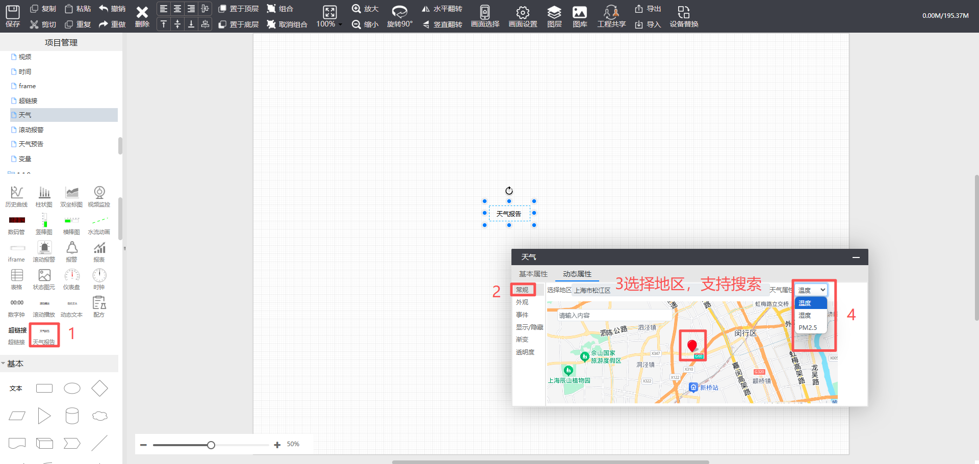 显示选择地区的天气预报,可选择温度、湿度、PM2.5